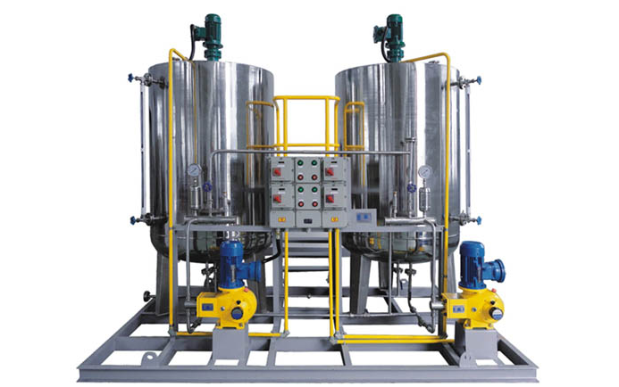 2、加藥裝置組成結構有:溶液箱、液位計、計量箱、攪拌器、加藥計量泵、安全閥、壓力表、控制柜、閥門以及管路集中布置,各部件的材質主要分不銹鋼和碳鋼襯膠。