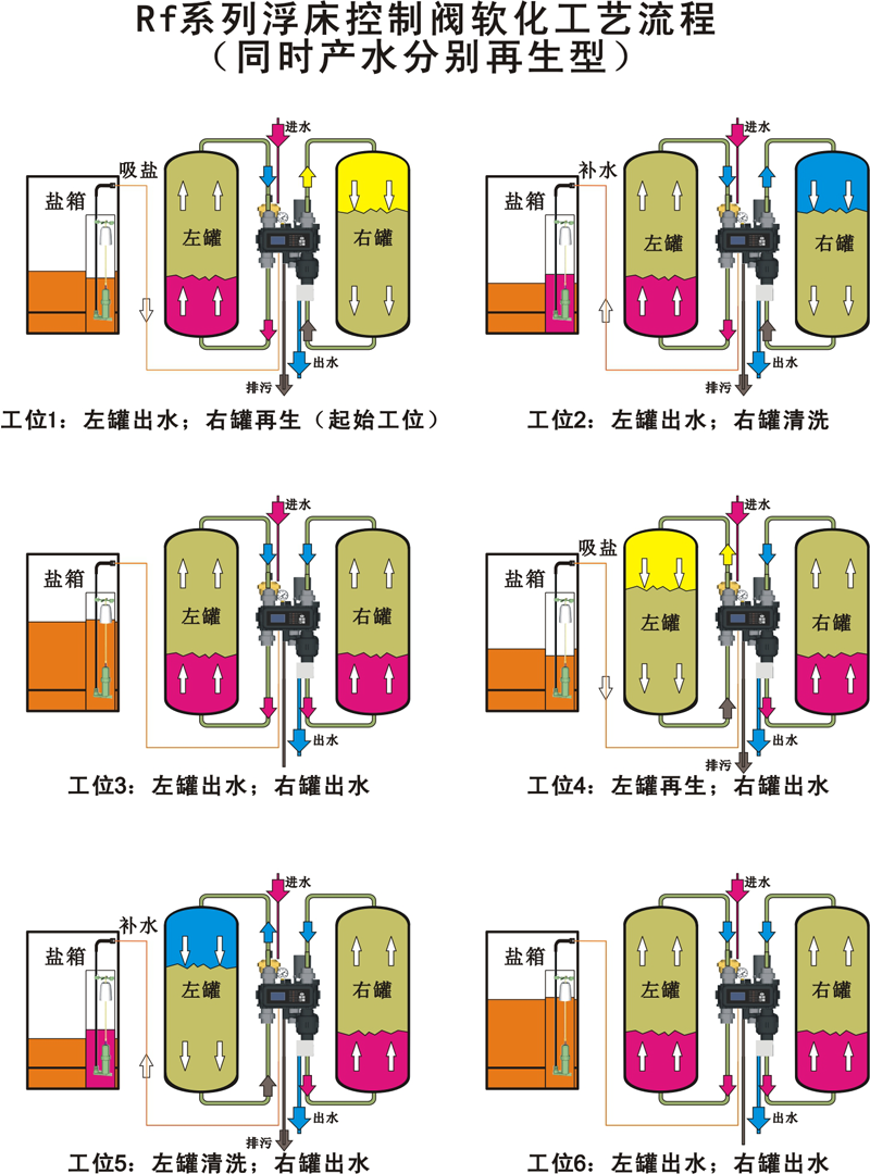 全自動(dòng)鈉離子交換器,依托專利產(chǎn)品多功能平面閥和現(xiàn)代先進(jìn)的自動(dòng)化微電腦技術(shù),用轉(zhuǎn)動(dòng)對(duì)位方式實(shí)現(xiàn)液相的切換、控制原水、軟化水、鹽液和廢水在系統(tǒng)內(nèi)的流量和流向,自動(dòng)完成交換器周期循環(huán)軟化過程的全自動(dòng)。