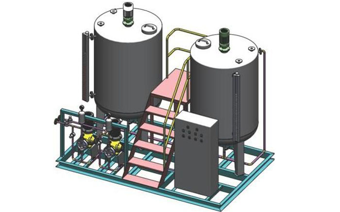 2、加藥裝置組成結構有:溶液箱、液位計、計量箱、攪拌器、加藥計量泵、安全閥、壓力表、控制柜、閥門以及管路集中布置,各部件的材質主要分不銹鋼和碳鋼襯膠。